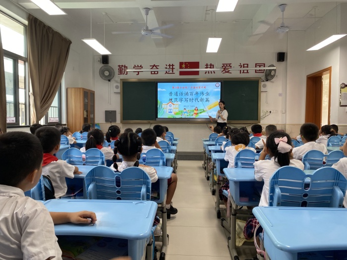 在德育處的組織下,各班精心開展了以“普通話誦百年偉業(yè),規(guī)范字寫時(shí)代新篇”為主題的班隊(duì)會活動,積極宣傳《中華人民共和國國家通用語言文字法》以及相應(yīng)的普通話基礎(chǔ)知識。