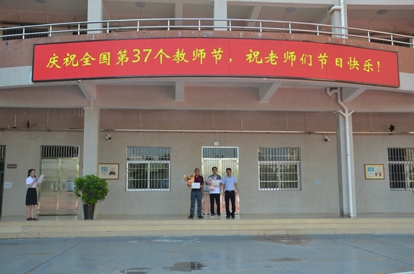 慶祝活動上,主持人羅曉玲老師帶著全體同學向全體老師送上了節(jié)日的問候與美好的祝福。接著,學校黨支部書記鄭碩果同志對學校“師德楷模”張小豐老師、甘允恒老師頒發(fā)了榮譽證書,并向全體師生介紹了兩位優(yōu)秀教師的先進事跡,號召大家向他們學習。