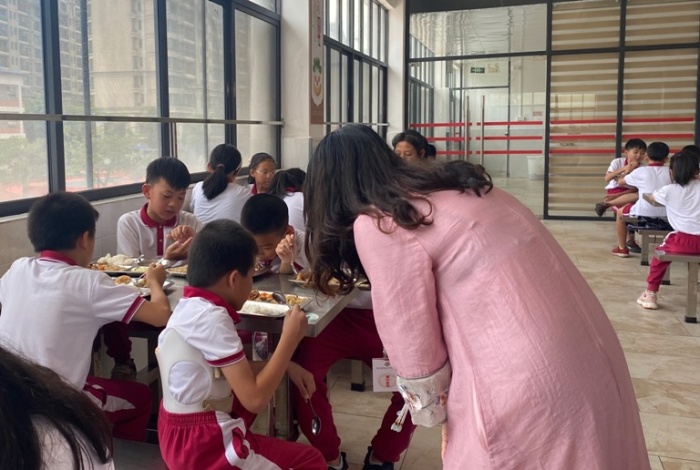 中午放學(xué)后,學(xué)生在整潔衛(wèi)生的校園食堂里文明排隊,安靜就餐。學(xué)校值日教師在飯?zhí)弥羞M(jìn)行巡查管理,并陪同學(xué)生就餐,及時監(jiān)督菜品安全和營養(yǎng)健康,關(guān)注學(xué)生是否吃飽。午餐結(jié)束后,學(xué)生在班級進(jìn)行自主閱讀與午休,值班教師巡班看護(hù),并隨時給予學(xué)生生活上的關(guān)懷和指導(dǎo)。