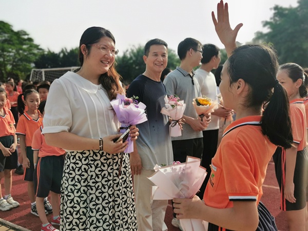 9月10日清晨,開發(fā)區(qū)中心小學在升旗臺前舉行感懷師恩的活動。莊嚴肅穆的升旗儀式之后,少先隊員代表配樂朗誦《感恩的心》,深情獻唱,致敬園丁。在《每當我走過老師窗前》優(yōu)美抒情的旋律中,一個個佩戴著紅領(lǐng)巾的少先隊員們,有序地向全體教師獻花,致以老師真誠的節(jié)日祝福。陽光下,閃耀著的不僅是高高飄揚的紅旗,更有老師和學生那一張張喜悅的笑臉。