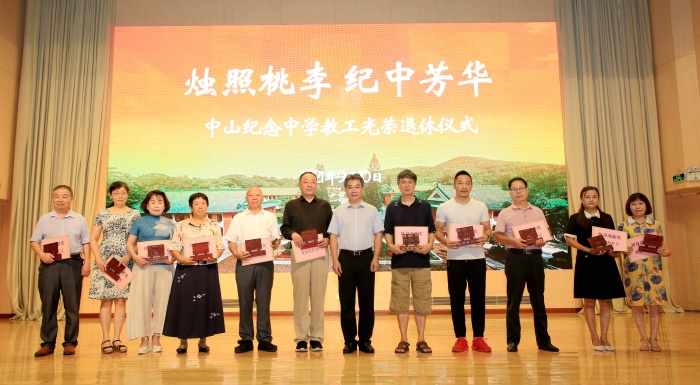 2021年9月10日,第37個(gè)教師節(jié),中山紀(jì)念中學(xué)在音樂(lè)廳召開(kāi)全體教工大會(huì),為25位退休教工舉行集體歡送儀式。