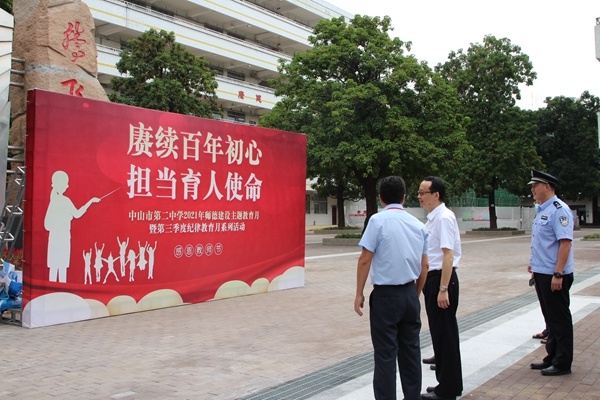 活動一:市領(lǐng)導(dǎo)蒞臨中山二中開展教師節(jié)慰問活動。9月10日上午,中山市副市長魯罡一行蒞臨中山二中開展教師節(jié)慰問活動。魯罡副市長走訪校園,視察校園基建工程,聽取中山二中黨委書記、校長吳祥明同志對學(xué)校歷史沿革、校史校情、二中近年發(fā)展情況的講解和匯報(bào)。黃圃鎮(zhèn)黨委書記梁泳輝,黃圃鎮(zhèn)黨委委員、市公安黃圃分局局長沈淼陪同慰問。