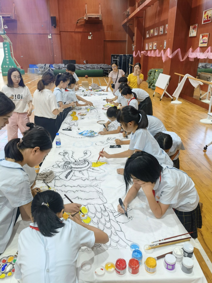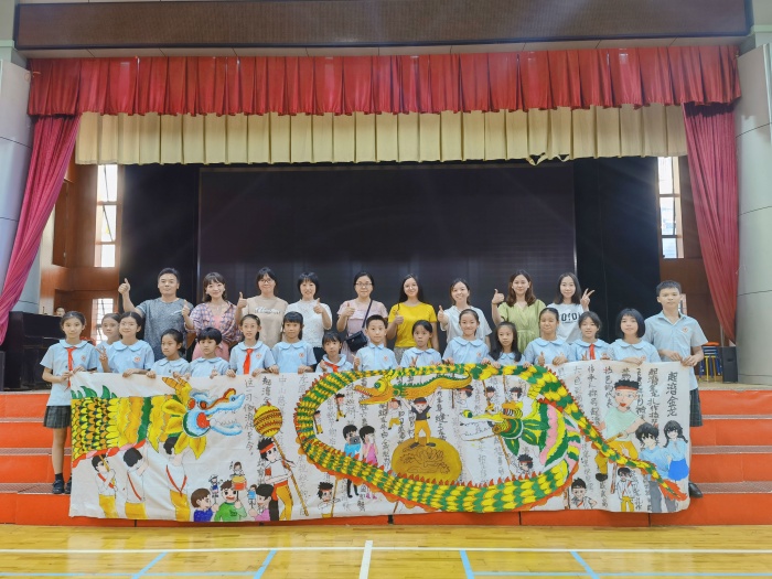為了弘揚(yáng)優(yōu)秀傳統(tǒng)文化,培養(yǎng)學(xué)生民族精神和愛國主義精神,讓非遺文化進(jìn)入校園。學(xué)校創(chuàng)作主題選取中山市非物質(zhì)文化遺產(chǎn)“起灣金龍”為主題,活動(dòng)前,教師通過給學(xué)生講解起灣金龍的來歷,讓孩子們對起灣金龍有進(jìn)一步的了解。隨后,20余名學(xué)生一起在畫卷上盡情繪畫。