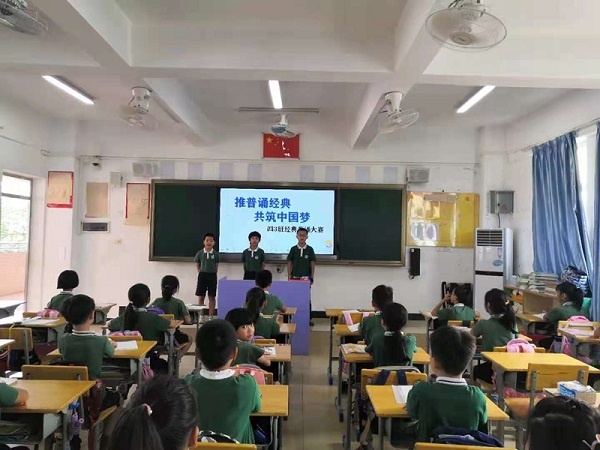 推普周里,五桂山學(xué)校一至六年級(jí)都開(kāi)展了“推普誦經(jīng)典,共筑中國(guó)夢(mèng)”的經(jīng)典誦讀大賽。一年級(jí)的同學(xué)童聲稚嫩,卻能瑯瑯上口誦讀著《大風(fēng)歌》 《詠鵝》 《江南》等小學(xué)生必背的75首古詩(shī),這也得益于學(xué)校一貫重視學(xué)生中華優(yōu)秀傳統(tǒng)文化的培養(yǎng)與傳承。中高年級(jí)的同學(xué)們自信滿滿地背誦著自己喜愛(ài)的古詩(shī)。詩(shī)詞大會(huì)的舉辦,讓同學(xué)們領(lǐng)悟到了中華詩(shī)詞的獨(dú)特魅力,領(lǐng)略到華夏文化的博大精深。更明白了說(shuō)好普通話的重要意義,關(guān)注了普通話的標(biāo)準(zhǔn)發(fā)音,更嚴(yán)格地要求自己說(shuō)話字正腔圓,提高了語(yǔ)言表達(dá)的能力,更加熱愛(ài)祖國(guó)的文字。