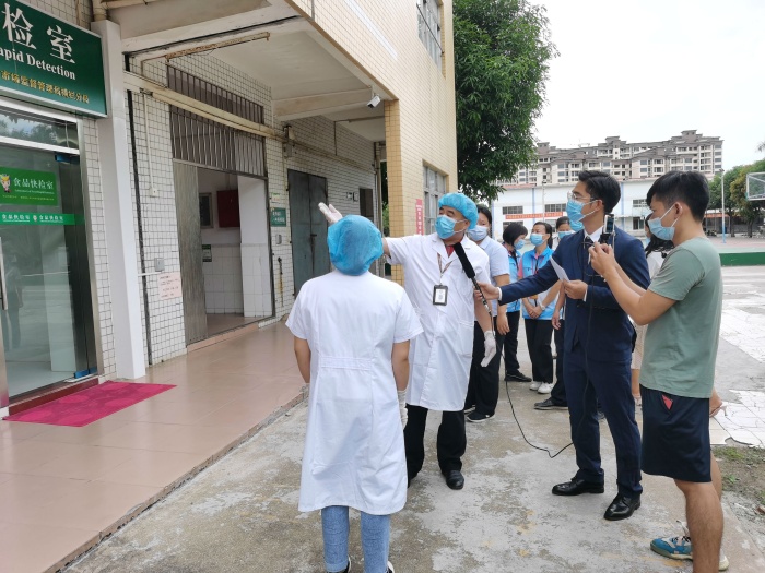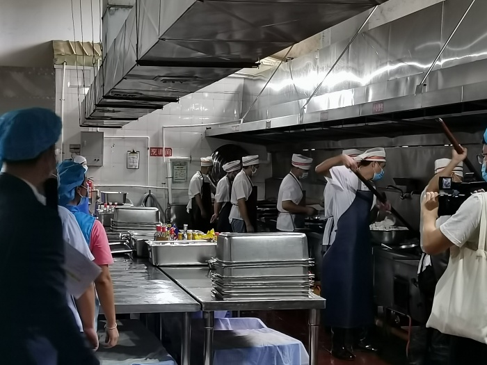 在網(wǎng)絡(luò)直播鏡頭的實(shí)況直播下,檢查組一行首先來到學(xué)校的食品快檢室,對食品安全監(jiān)測設(shè)備、監(jiān)測流程、監(jiān)測記錄、食品安全公示情況等進(jìn)行了詳細(xì)的檢查和實(shí)況直播。隨后,檢查組深入到學(xué)校食堂的每一處,對食堂防疫措施、食品采購、食品清洗、食品加工、食品檢測、食品衛(wèi)生、食材的存儲和來源、餐具消毒、大米質(zhì)量、菜品種類等情況進(jìn)行了詳細(xì)地檢查,視頻攝制組也對現(xiàn)場的情況進(jìn)行了實(shí)況直播。